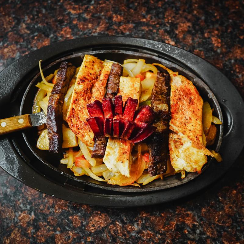 Meat chunks cooked on the grill with bell peppers, onions, and tomatoes. Served with rice, beans, guacamole, salad, and tortillas.