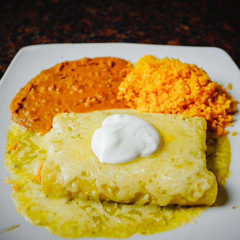 Three enchiladas, your choice of beef or chicken, or cheese with rice and beans.