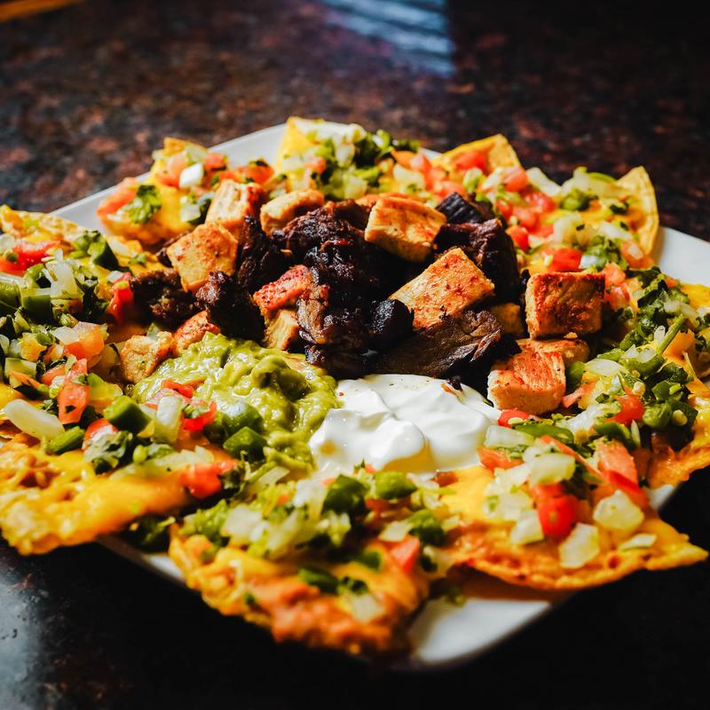 Your choice of meat. With beans, lettuce, tomatoes, cheese, sour cream, and guacamole