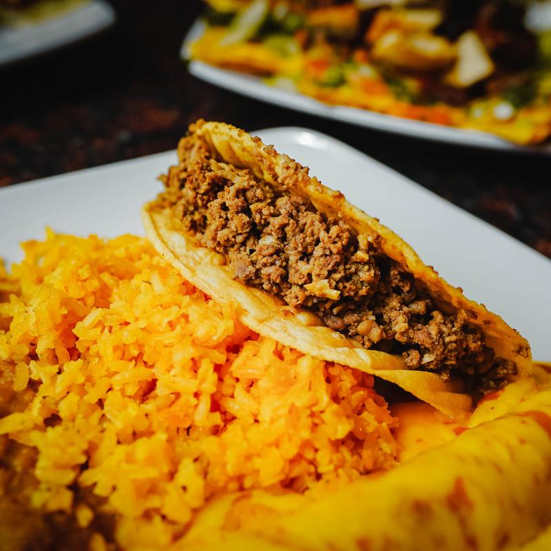(2) Crispy tacos, (1) enchilada, rice, and beans.
